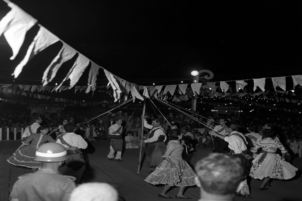 Uma dessas fotografias é datada de 21 de junho de 1959, porém não há informações sobre a localização exata da celebração. A imagem mostra um grupo formado por homens e mulheres, trajados com roupas típicas de festa junina. O grupo está de mãos dadas e parece formar uma quadrilha. Veja: