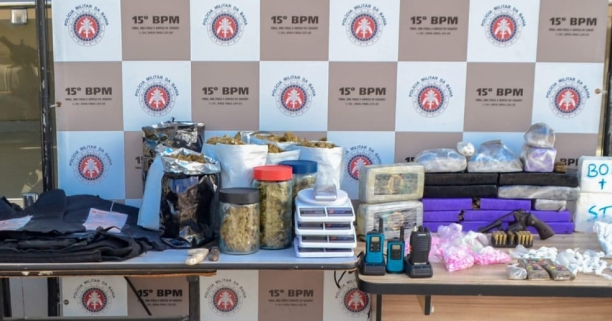 20 kg de drogas, uma arma de fogo, rádios comunicadores e um veículo foram apreendidos por policiais militares do 15º BPM, nesta quarta-feira (26), no bairro de Novo Horizonte, no município de Itabuna.
