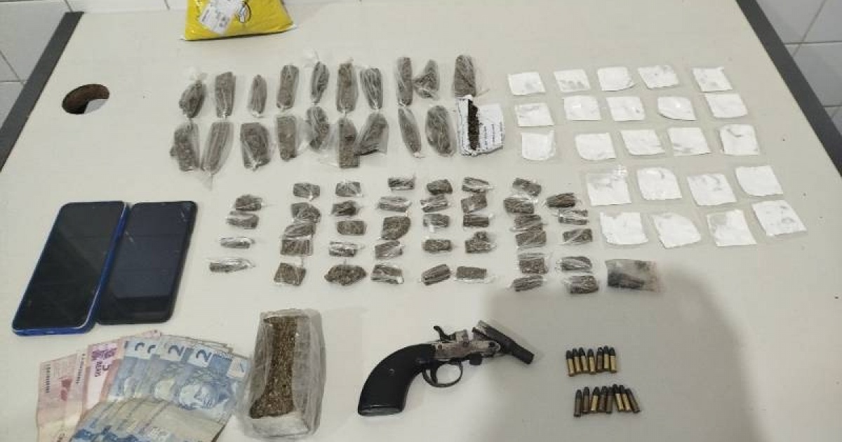 Com ele foram encontrados um revólver calibre .22 com 15 munições do mesmo calibre,71 invólucros com maconha e 23 papelotes de cocaína.