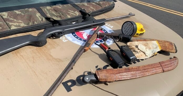Após a abordagem, os policiais encontraram duas espingardas, munições dos calibres 22 e 24 além de rádios comunicadores.