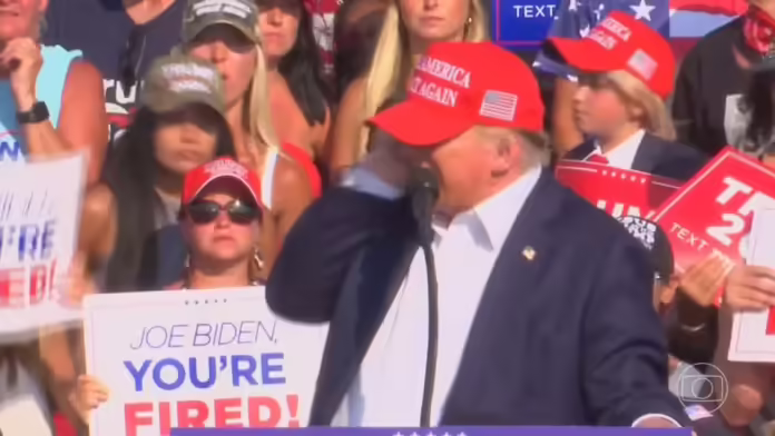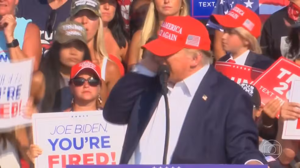 Um comício de Donald Trump em Butler, no estado da Pensilvânia, foi abruptamente interrompido neste sábado (13) após o som de tiros ser ouvido. O ex-presidente dos Estados Unidos, juntamente com seus apoiadores presentes, reagiu imediatamente ao barulho, levando todos a se abaixarem em busca de proteção. Em seguida, agentes do serviço secreto retiraram Trump do palco e o escoltaram para um local seguro, enquanto o público era evacuado do local. Ao se levantar, ele aparentava ter ferimentos na orelha direita e na bochecha. Um porta-voz da campanha do líder republicano afirmou que ele está bem. O incidente ocorreu momentos depois de Trump iniciar seu discurso, que durou cerca de dez minutos, levantando a expectativa de um importante anúncio sobre sua escolha para vice-presidente. Enquanto isso, o Serviço Secreto tratava a área como uma cena de crime ativa, investigando os possíveis disparos.