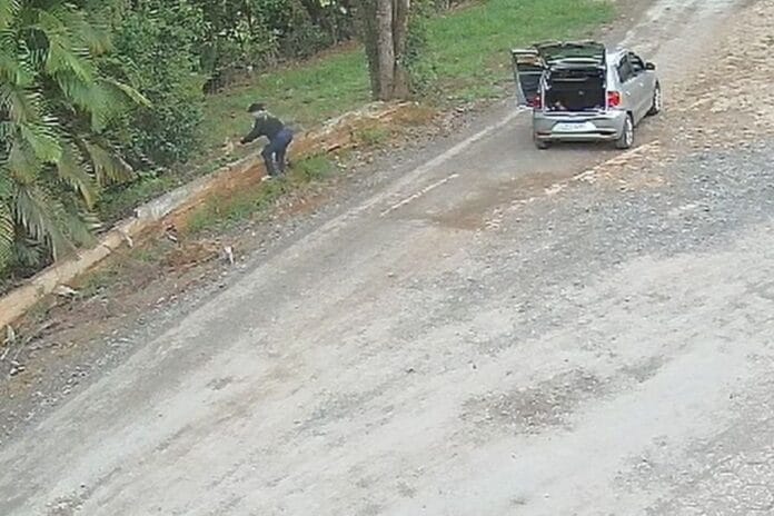 As imagens mostram o momento em que a mulher estaciona o carro, abre o porta-malas do veículo, pega os animais e os arremessa em direção a um terreno ao lado da calçada.