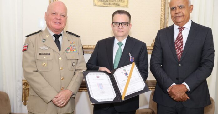 Em uma cerimônia liderada pelo Coronel Coutinho, Comandante-Geral da Polícia Militar da Bahia, o desembargador César Jatahy, do Tribunal Regional Federal da 1ª Região (TRF1), foi agraciado, nesta sexta-feira (19), com a medalha da Ordem do Mérito da Polícia Militar. Esta honraria foi concedida em 2018, pelo então comandante da PM-BA, Coronel Anselmo Brandão.