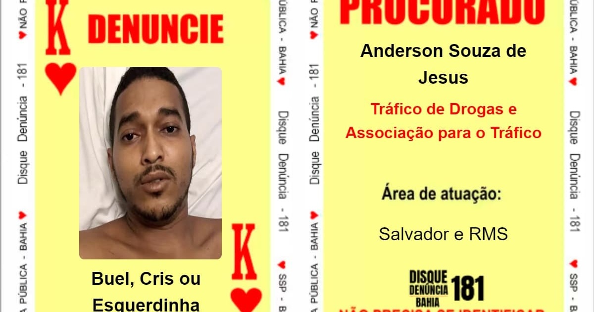Acusado de ser o principal fornecedor de armas para facções criminosas que atuam na Bahia, Anderson Souza de Jesus, conhecido como “Buel”, “Cris” ou “Esquerdinha”, foi incluído no Baralho do Crime da Secretaria da Segurança Pública. Ele é representado como o ‘Rei de Copas’, sendo procurado por tráfico de drogas, associação para o tráfico e diversos homicídios. As autoridades acreditam que ele possa estar escondido no estado do Rio de Janeiro e é considerado o alvo de maior prioridade da polícia baiana.