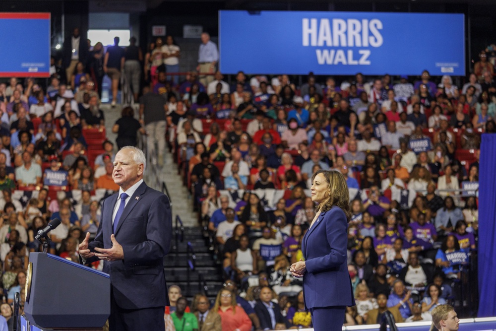 Kamala Harris faz 1º comício ao lado de Tim Walz, seu candidato a vice-presidente dos EUA