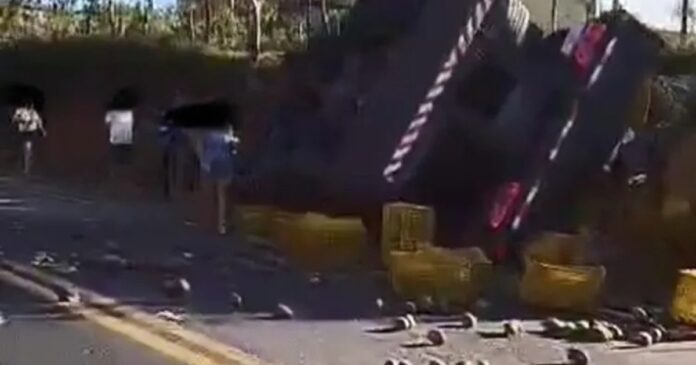 Acidente em Caetité: Caminhão carregado de mangas tomba deixando casal ferido