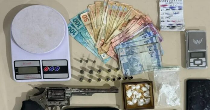 Após denúncias de um indivíduo que teria se escondido em um terreno abandonado, a patrulha se deslocou até o local e encontrou o suspeito com uma mochila. Durante a busca, foram localizados um revólver calibre .38, 13 papelotes de substância semelhante à cocaína, uma porção extra da mesma substância, duas balanças de precisão, dois celulares, 9 munições de calibre .38, 3 munições de calibre .22, 4 cápsulas deflagradas de calibre .32 e R$ 1.094,00 em espécie.