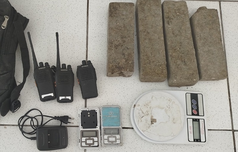 Ao inspecionar o conteúdo da mochila, os agentes encontraram três rádios comunicadores, três balanças de precisão, um suporte carregador de rádio, uma mochila e quatro tabletes de maconha.