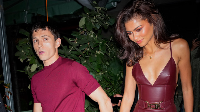 Zendaya deslumbrou com um vestido bordô de couro enquanto o companheiro usou uma camisa do mesmo tom e calças escuras.
