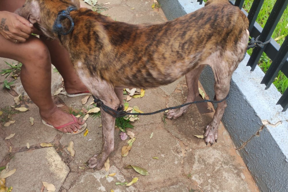 O cachorro apresentava, segundo a Polícia Ambiental, sinais claros de maus-tratos, como magreza excessiva, apatia, lesões no rabo e sarnas espalhadas pelo corpo.