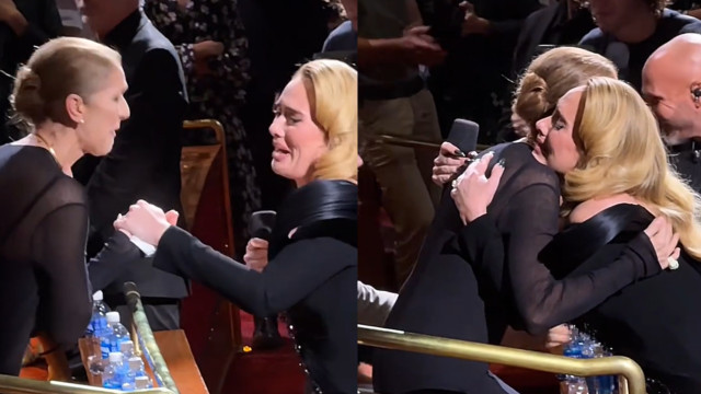 Um vídeo, captado por um fã, mostra o momento em que Adele percebe a presença da intérprete de ‘My Heart Will Go On’, parando imediatamente de cantar para lhe dar um abraço.