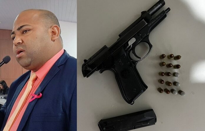 Durante o cumprimento de mandados de busca e apreensão na residência do vereador e em seu gabinete na Câmara Municipal, os policiais encontraram uma pistola calibre 9mm com a numeração raspada, escondida na caixa acoplada de um vaso sanitário.