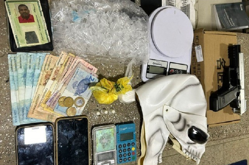 Na abordagem, is policiais apreenderam: 98 gramas de cocaína; 01 celular Motorola; 01 celular Samsung; 02 balanças de precisão; 01 simulacro de arma de fogo; 01 máscara; Vasta quantidade de empendoff para acondicionar cocaína; 01 carteira com documentos pessoais; 01 maquininha de cartão de crédito; R$ 723,75 em espécie.