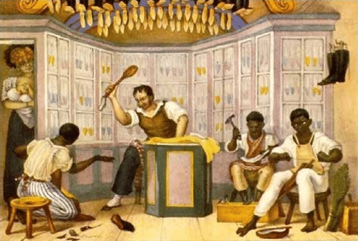 Muitas fábricas, muitos produtos, mas os negros e negras escravizadas, a maioria da população, consumiam apenas parte desses bens. O francês Jean Baptist Debret, que integrou a Missão Artística Francesa em 1817, ficou estupefato. “O europeu que chegasse ao Rio de Janeiro mal poderia acreditar, diante do número considerável de sapatarias, todas cheias de operários, que esse gênero de indústria se pudesse manter numa cidade em que os cinco sextos da população andam descalços.”