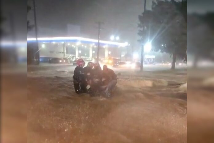 Nas imagens, vários motociclistas tentam ajudar um colega que tentou seguir viagem, mas não conseguiu. Enquanto isso, outros aguardam debaixo de uma marquise a chuva dar trégua.