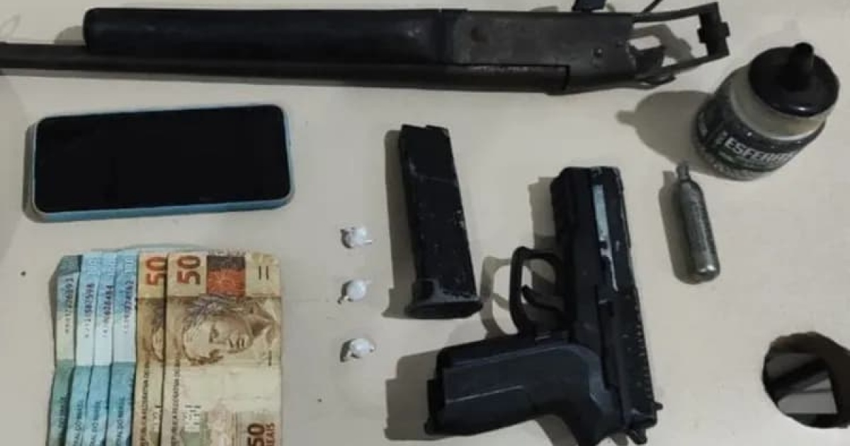 No decorrer da revista, foram encontradas duas petecas de substância semelhante a cocaína, R$ 502 em dinheiro e um celular, além de um simulacro de arma de fogo e uma espingarda CBC 651 no interior do veículo.