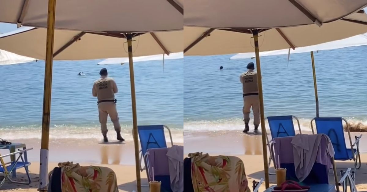 Vídeos que circulam nas redes sociais mostram um policial apontando a arma para uma pessoa no mar, enquanto o suspeito nada em direção mais funda.