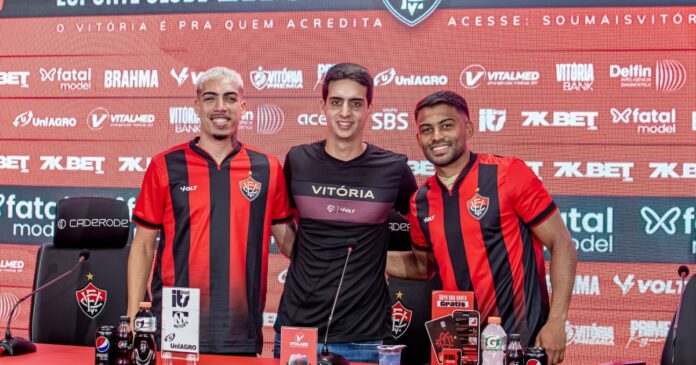 Resumo: *O Vitória apresentou dois novos reforços: o lateral Hugo, vindo do Botafogo por empréstimo, e o volante Ronald, contratado sem custos. Ambos foram oficializados e já estão à disposição do clube. Hugo concorre com Lucas Esteves pela posição, enquanto Ronald chega para reforçar o meio-campo em meio a uma forte concorrência.*