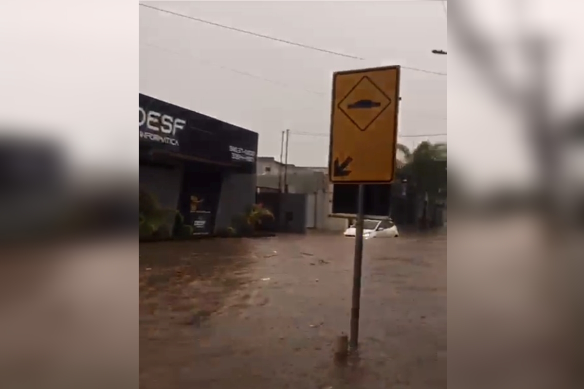 Imagem de uma rua alagada. À frente, há uma placa de trânsito indicando um quebra-mola, que não pode ser visto dada a altura da enxurrada. Mais à frente, um carro branco quase que totalmente submerso pela água
