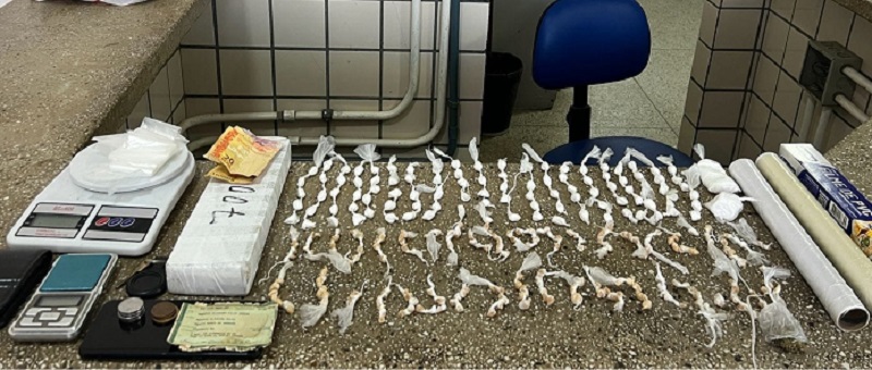 Durante a abordagem, foram encontrados 20 papelotes de cocaína na posse do suspeito. Posteriormente, em busca realizada em sua residência, foram localizados diversos entorpecentes, incluindo maconha, cocaína e crack, juntamente com duas balanças de precisão e materiais para embalagem das substâncias ilícitas.