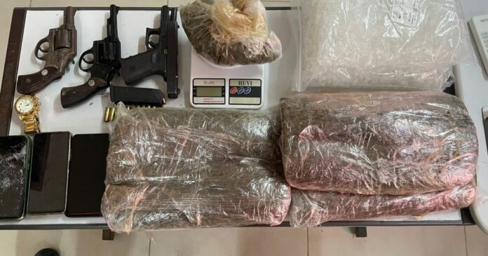 Com os criminosos foram apreendidos uma pistola, dois revólveres, carregadores, munições, drogas, balança, celulares, entre outros itens.
