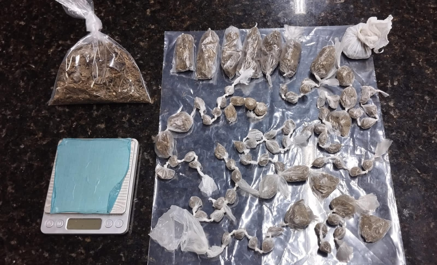 Na abordagem realizada, seguida de busca pessoal, os policiais encontraram dentro da sacola o seguinte material: 79 (setenta e nove) pedaços de tamanhos variados de maconha (123,8 gramas); 01(uma) porção fragmentada de maconha (70 gramas), embalagens plásticas para acondicionamento da droga e 01 (uma) balança de precisão.