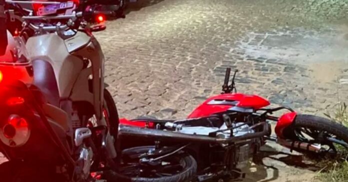 Durante rondas pela avenida Dacio Oliveira, por volta das 20h10, a equipe policial avistou uma motocicleta sem placa e com o escapamento adulterado, causando ruídos excessivos. Ao tentar abordar o veículo, o condutor, em uma tentativa de fuga, fez uma curva brusca, perdeu o controle e caiu. Em seguida, ele abandonou a moto e fugiu correndo por terrenos baldios próximos, deixando para trás o veículo, um celular e um relógio.