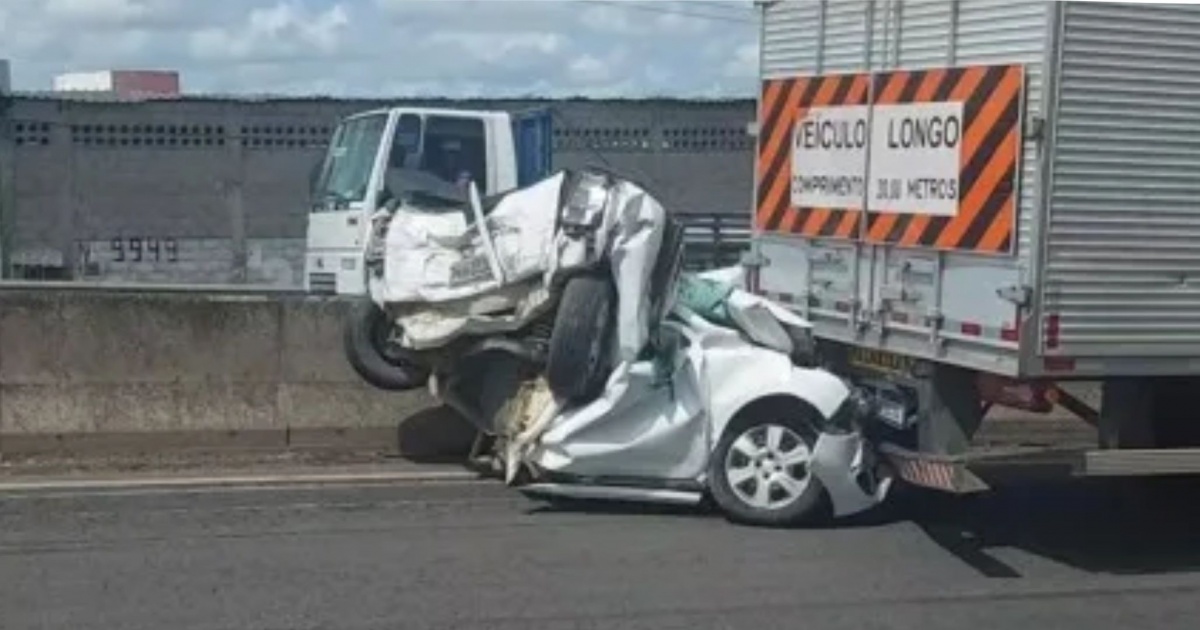 Imagens do local mostram um veículo de passeio completamente prensado entre os dois caminhões, em um cenário de grande impacto visual. Apesar da gravidade da colisão, a Polícia Rodoviária Federal (PRF) afirmou que não houve feridos graves no incidente.