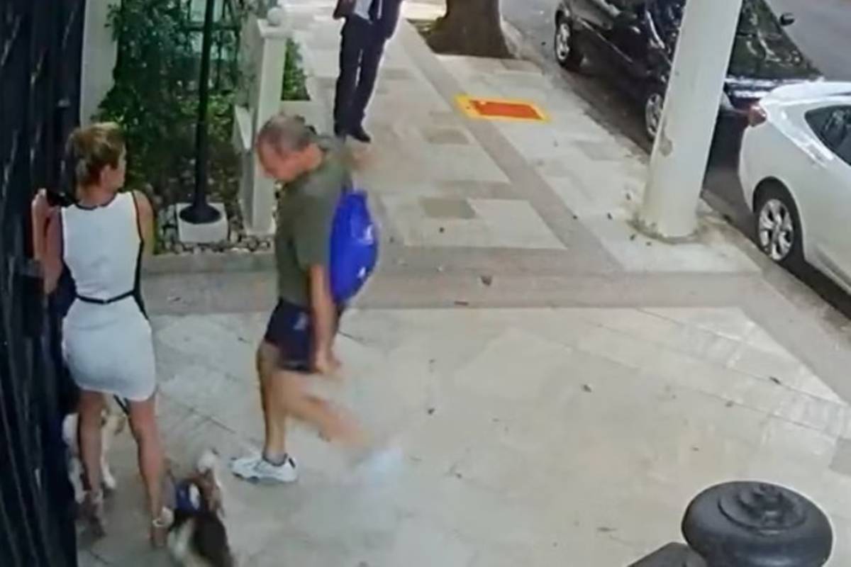 • Uma câmera de segurança registrou o momento da agressão, em 16 de outubro de 2023. Nas imagens, é possível ver que Rogério Cardoso Júnior deu pontapés em Caroline Zanin e nos cachorros dela.