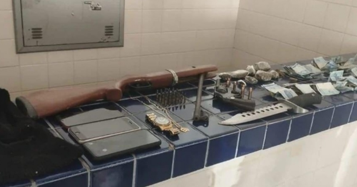 Após buscas, o suspeito foi localizado. Durante a abordagem e buscas no local, os policiais encontraram um revólver calibre 38 com seis munições, uma espingarda de fabricação artesanal e outra de ar comprimido. Além disso, foram encontradas 29 munições calibre 22, oito porções de maconha, três celulares, um relógio, uma corrente dourada, uma faca de caça, chumbo, pólvora, uma balaclava e dinheiro em espécie.