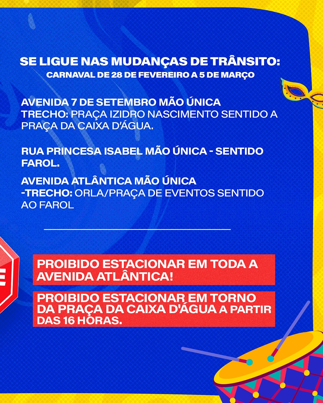• Fica proibido estacionar em toda a Avenida Atlântica durante o período do Carnaval.