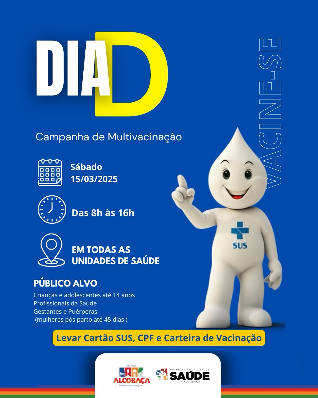 A Secretaria Municipal de Saúde de Alcobaça promove, neste sábado (15)  o Dia D da Multivacinação, mobilizando as equipes das unidades básicas de saúde e toda a população para atualizar a caderneta de vacinação de crianças, adolescentes e adultos.