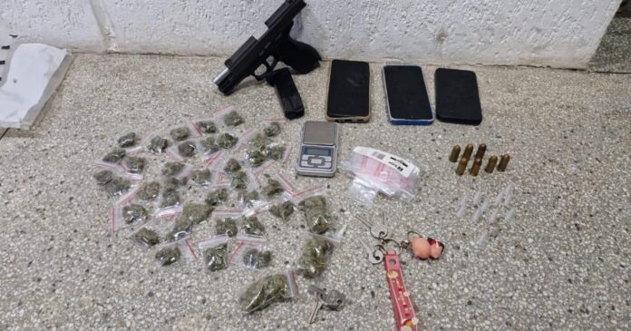 Com o grupo, as autoridades encontraram uma pistola calibre 45, um carregador com munições, 38 porções de maconha, 11 pinos de cocaína e uma balança de precisão. Um dos detidos já tinha sido detido anteriormente em fevereiro deste ano, no mesmo bairro, por porte ilegal de arma de fogo.