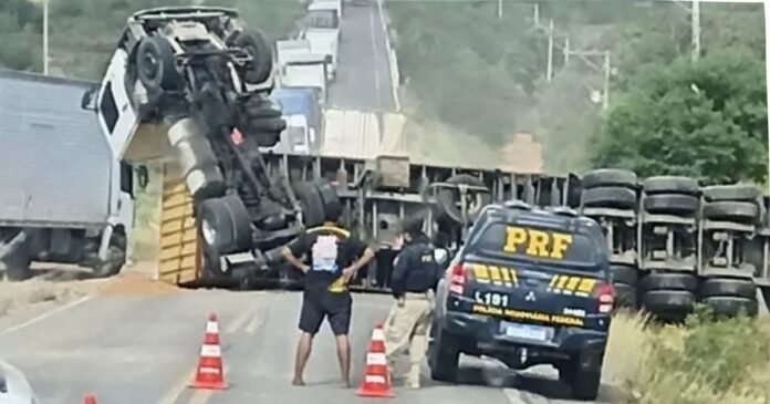 Na madrugada desta sexta-feira (04), motoristas que trafegam pela BR-410, no trecho entre Ribeira do Pombal e Tucano, no Nordeste da Bahia, enfrentaram lentidão no trânsito devido ao tombamento de uma carreta carregada com um contêiner. O veículo ficou atravessado na pista, formando um ângulo em “L”, porém, apesar do susto, não houve registro de feridos.