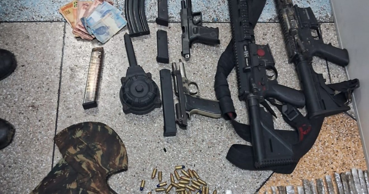 Entre os itens apreendidos com os detidos estavam dois fuzis 556, um deles com a numeração raspada, três pistolas 9mm também com numerações adulteradas, além de 192 munições 9mm, 56 munições 556, cinco carregadores para 9mm (sendo três alongados), um carregador em forma de caracol, dois carregadores de fuzil, uma balaclava, duas granadas, 618 porções de maconha e R$ 1.932 em dinheiro.