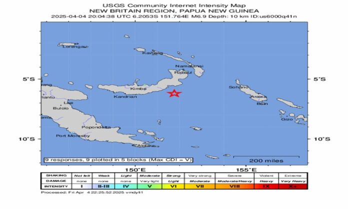 Um terremoto de magnitude 6,9 atingiu a ilha de Nova Bretanha, em Papua-Nova Guiné, nesta sexta-feira (4). O epicentro do tremor foi localizado cerca de 194 quilômetros a sudeste de Kimbe, a cidade mais próxima. O evento gerou alertas de tsunami, posteriormente cancelados pelo Centro de Alertas de Tsunamis do Pacífico, conforme informações do Serviço Geológico dos Estados Unidos (USGS).