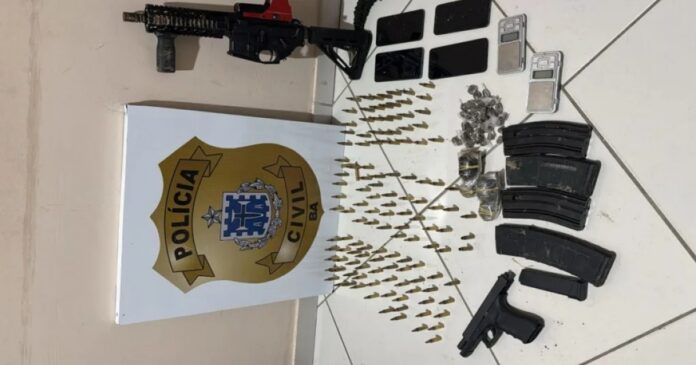 Na sexta-feira (25), a Polícia Civil da Bahia, por meio da 23ª Coordenadoria Regional de Polícia do Interior (Coorpin/Eunápolis), realizou uma apreensão significativa de armamentos e munições em um local identificado como “assentamento”, na zona rural de Eunápolis, no sul da Bahia. Durante a operação, os policiais apreenderam um fuzil calibre 5,56, quatro carregadores e 129 munições do mesmo calibre. Também foram encontrados quatro granadas, uma pistola 9 mm, um carregador e oito munições.