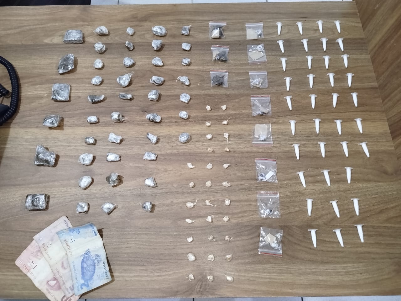 Na bolsa, os agentes encontraram 37 pinos de cocaína, 43 buchas de maconha, 29 pedras de crack, 8 papelotes de haxixe e 3 papelotes de skunk – uma variação da cannabis com maior concentração de substâncias psicoativas. Também foram apreendidos dinheiro em espécie e materiais associados ao tráfico de drogas.