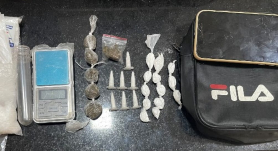 Durante a revista, os policiais encontraram uma bolsa contendo drogas e materiais utilizados no tráfico 07 pinos de substância análoga à cocaína, 13 trouxinhas de substância análoga à cocaína, 06 buchas de maconha, 01 balança de precisão, 01 celular Motorola (cor azul), Sacos plásticos utilizados para embalar drogas e 01 bolsa preta (marca Fila).