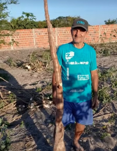 Railton Santana, de 57 anos, relata que é a primeira vez que encontra uma raiz desse tamanho em seu cultivo. Ele explica que, na localidade, a mandioca normalmente leva entre 10 e 12 meses para crescer, devido à baixa pluviometria.