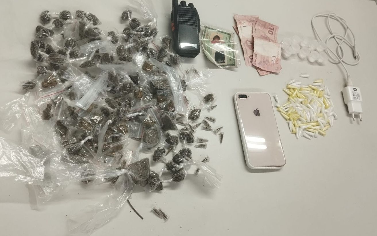 Durante a patrulha, os policiais observaram o suspeito tentando descartar um recipiente plástico ao perceber a aproximação das forças de segurança. Após a abordagem, foi feita uma revista que resultou na apreensão de 228 porções de maconha, 145 pinos de cocaína, um rádio transmissor, um telefone celular e uma quantia em dinheiro.