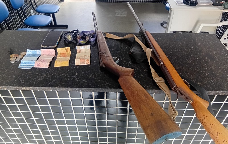 As autoridades apreenderam as espingardas de fabricação artesanal, um aparelho celular, um relógio digital, diversas chaves residenciais e R$ 99,55 em dinheiro. Moyses e Alaece foram levados à Delegacia Territorial da Polícia Civil de Itamaraju, onde o delegado Gilvan de Meireles Prates lavrou o auto de prisão em flagrante.
