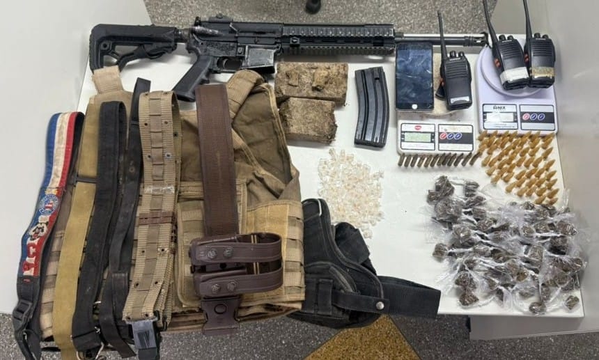 Após o confronto, a polícia realizou buscas na área e localizou um fuzil calibre 5,56 com um carregador e 12 munições, além de 100 pedras de crack, 82 porções de maconha e dois tabletes da mesma substância. Também foram encontrados 52 pinos de cocaína, uma capa de colete balístico, três rádios comunicadores, um celular, quatro bandoleiras, duas balanças de precisão e um coldre.