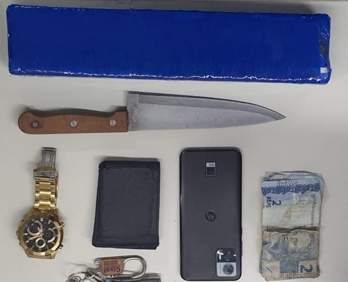 O primeiro incidente ocorreu quando um homem tentou escapar em um veículo. Ele foi interceptado e, ao ser abordado, os policiais encontraram um tablete de maconha de 1kg e uma faca.