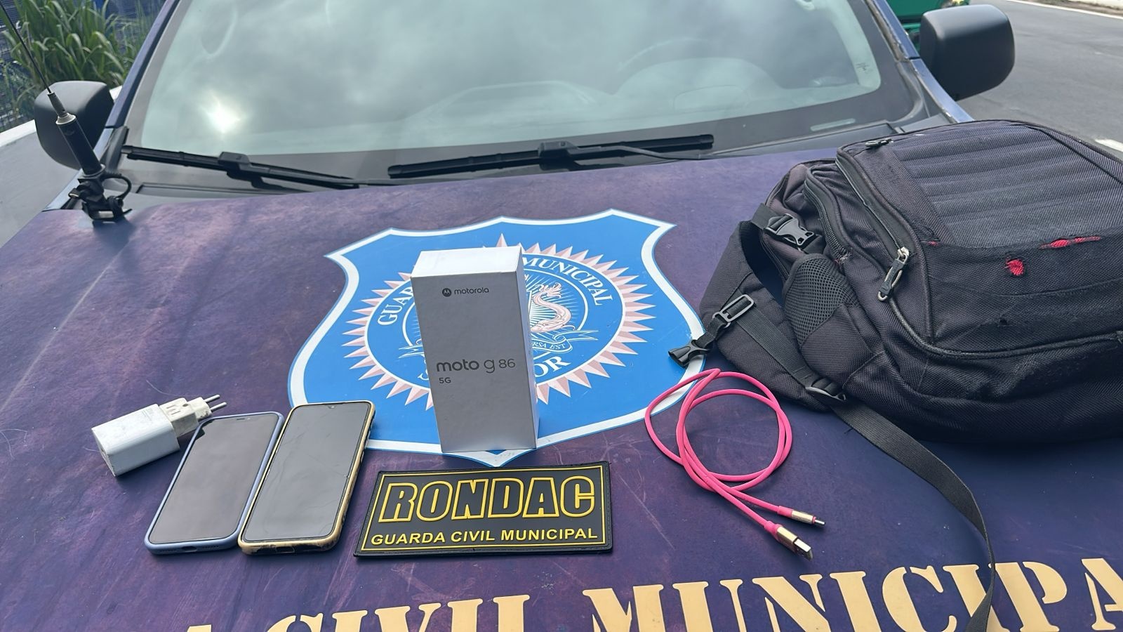 Os agentes observaram os ocupantes de uma motocicleta realizando manobras perigosas em alta velocidade. Ao abordá-los, encontraram uma mochila contendo vários aparelhos eletrônicos, incluindo um item lacrado e sem nota fiscal. O passageiro admitiu fraudes relacionadas a estelionato e revelou que havia notificado um receptador sobre a situação.