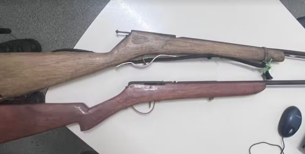 Ao chegarem no local, os policiais encontraram a mãe visivelmente abalada e o pai ainda presente na casa. Durante a abordagem, foram encontradas duas armas de fogo caseiras com o suspeito.