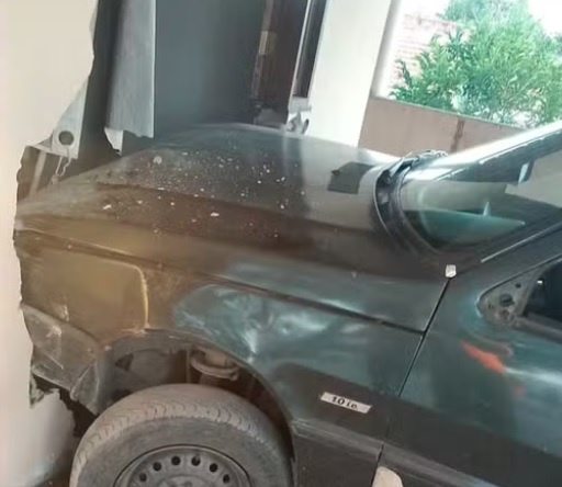 O acidente aconteceu quando o Fiat Uno bateu na lateral de um carro e, em seguida, invadiu um terreno, colidindo com a parede de uma residência. O impacto destruiu parte da estrutura da frente da casa.
