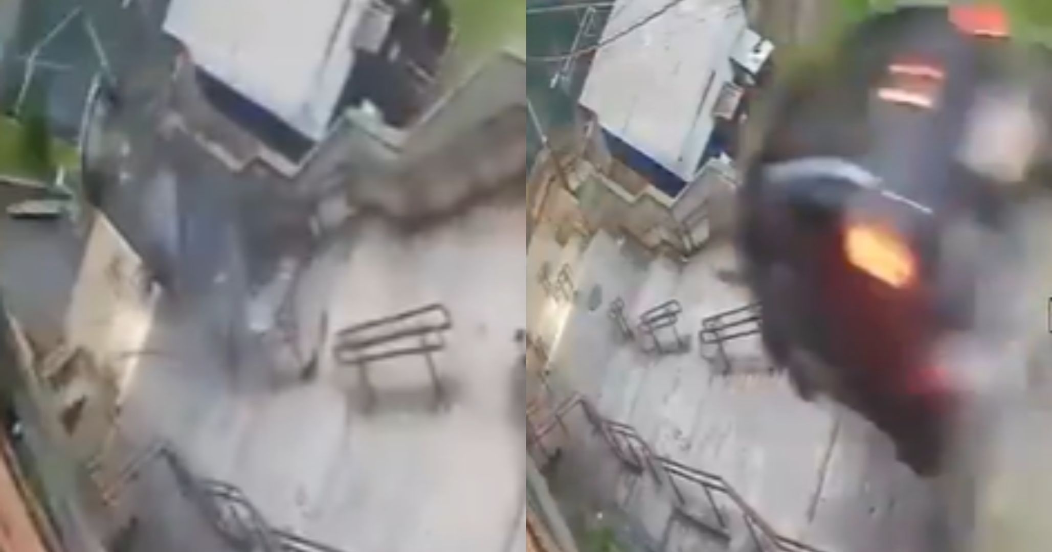 As imagens mostram o carro se afastando da via e atingindo a escadaria a alta velocidade, “voando” por alguns metros antes de parar. A velocidade no impacto é bastante evidente nos vídeos.