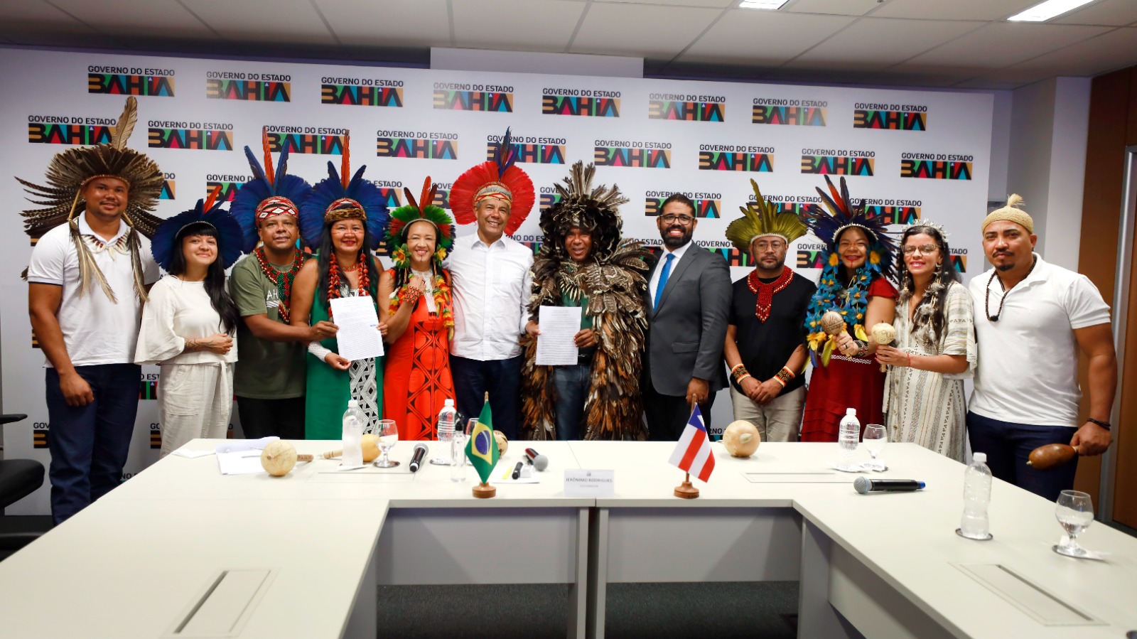 A Bahia passa a ter dois territórios indígenas oficialmente demarcados: Tupinambá de Olivença, localizada nos municípios de Ilhéus, Buerarema e Una; e Comexatibá, do povo Pataxó, situada no município de Prado. Para celebrar o anúncio, o governador Jerônimo Rodrigues se reuniu nesta terça-feira (18), no Centro de Operações e Inteligência (COI), com o secretário de Justiça e Direitos Humanos, Felipe Freitas; a superintendente de Políticas para os Povos Indígenas, Patrícia Pataxó; o cacique Babau Tupinambá; e lideranças do povo Pataxó.
