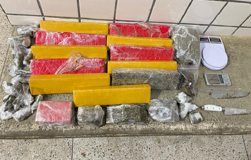 A apreensão incluiu 11 tabletes de maconha, 33 pedaços e 2 porções menores, além de uma mala preta, balanças de precisão, facas e material para embalagem. Todo o material foi levado à Delegacia de Polícia para registro e investigação.